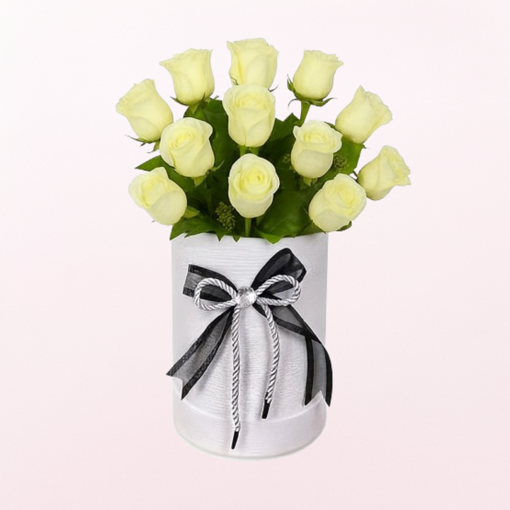 This elegant flower box features 12 fresh white roses neatly arranged in a premium hat box with a black decorative ribbon bow on the front. The roses are tightly packed to create a full, balanced and symmetrical look. The box design gives a clean, modern and luxury presentation, with stems completely hidden inside the box. White roses represent purity, elegance, respect and sincerity, making this arrangement suitable for birthdays, anniversaries, weddings, sympathy gestures, apologies and formal gifting. This box bouquet is fully gift-ready and requires no additional wrapping.