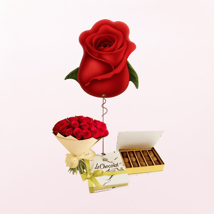 24 Red Roses Hand-Tied Bouquet with Mixed Chocolates & Rose Bud Foil Balloon – 3-in-1 Gift Set