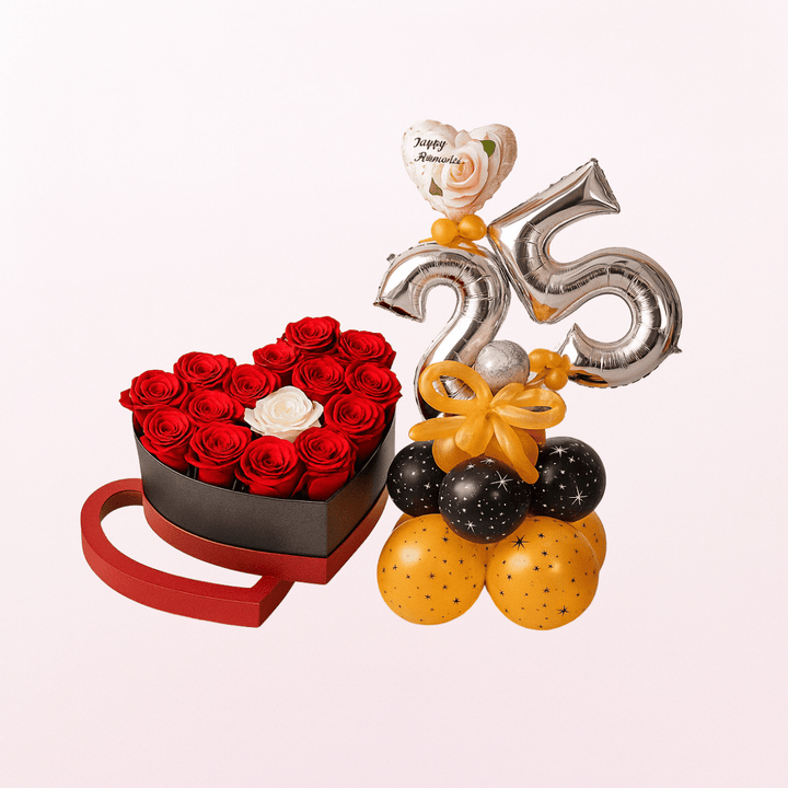 Make the 25th celebration truly special — whether it’s a birthday or an anniversary — with this elegant gift combo. Express your love and appreciation through this beautiful arrangement of colourful latex balloons paired with 15 fresh red roses, presented in a heart-shaped box. This stunning combo is designed to create unforgettable memories with your loved one in a unique way. Its charming design makes it perfect for both personal celebrations and party décor. You can also gift this splendid combo to anyone celebrating their 25th birthday or 25th wedding anniversary.