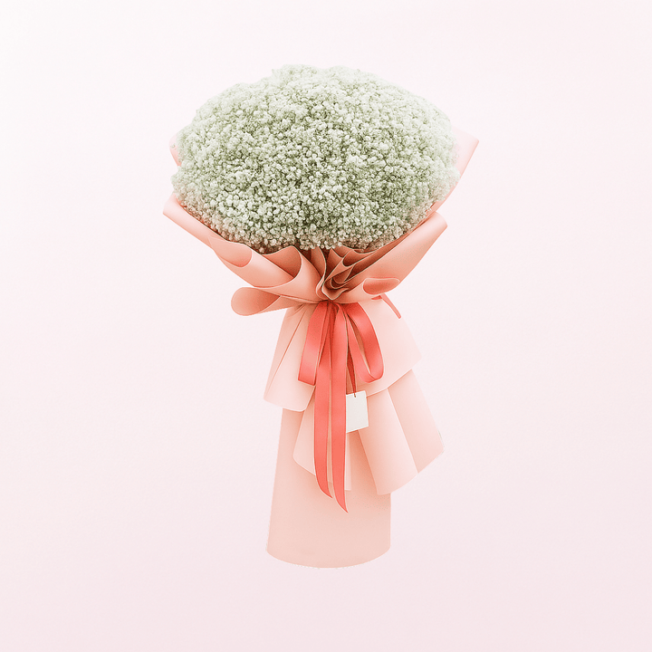 Hand-tied bouquet of WHITE gypsophila gently crafted in a CLASSY pink wrapping.