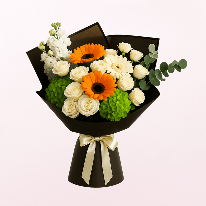 Mixed Flowers is a symbol of respect, love, and courage that continues to attract all. This cheerful hand bouquet is crafted with a vibrant mix of orange and white gerberas, fresh white roses, and bright yellow and white chrysanthemums, beautifully wrapped to bring warmth, joy, and positivity to any occasion. Designed with long stems and premium seasonal blooms, it makes the perfect gift for birthdays, thank-you gestures, congratulations, or simply brightening someone’s day with an elegant burst of color.