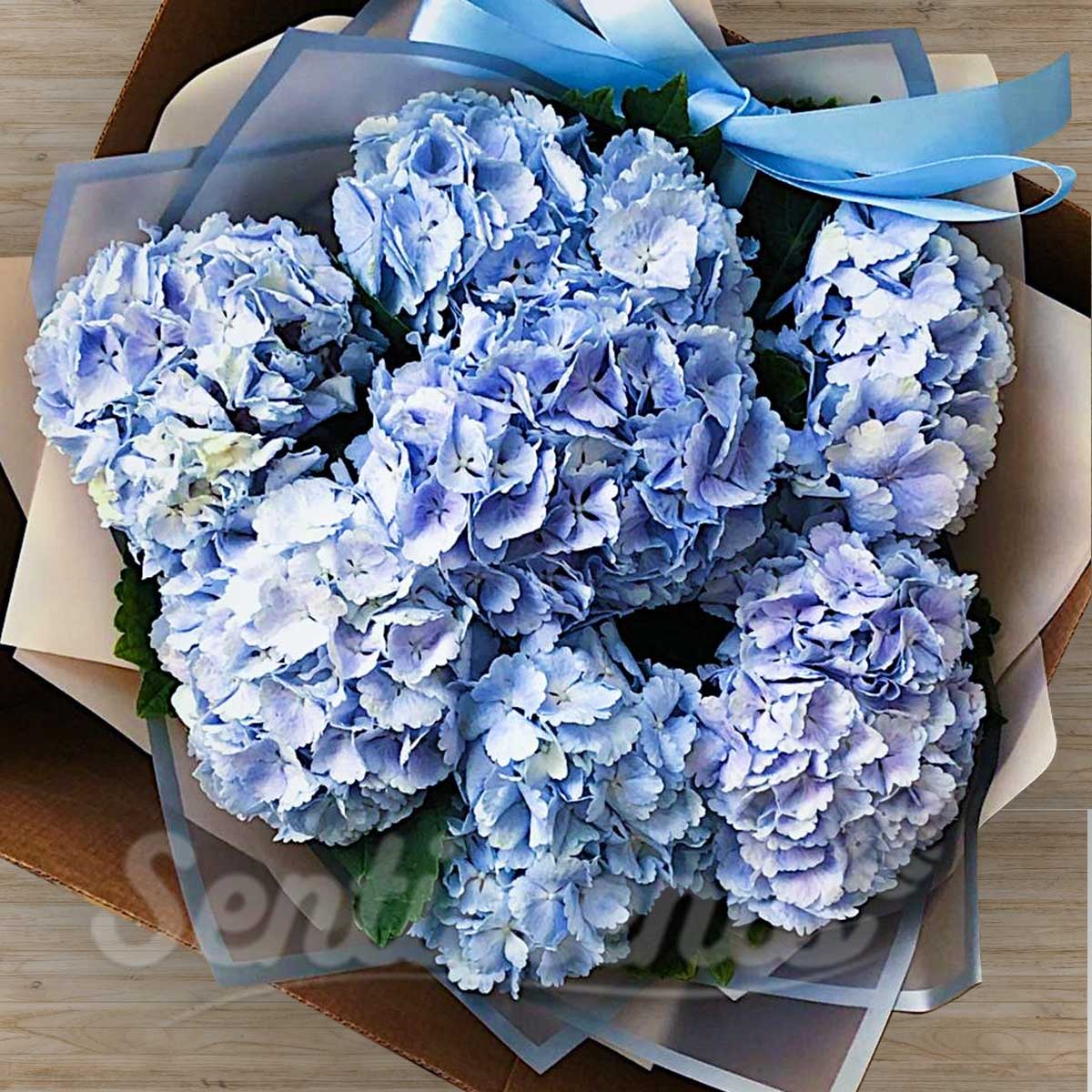 Hand-tied bouquet of 7stem Blue hydrangea gently crafted in a beautiful wrapping.
