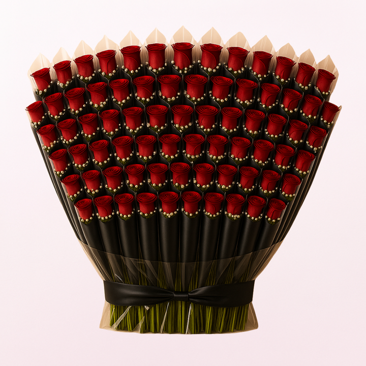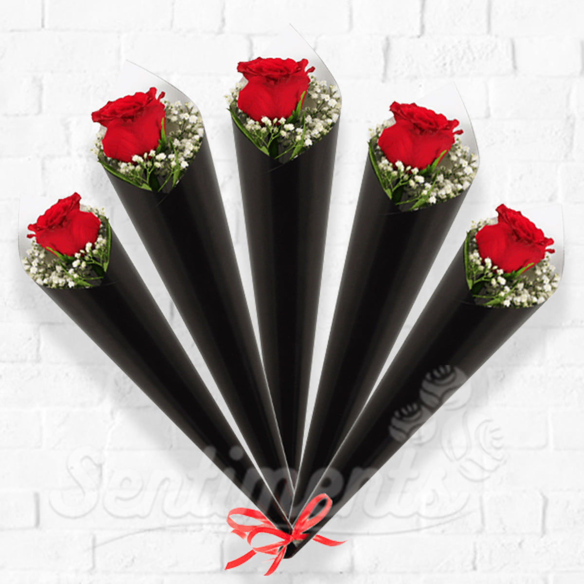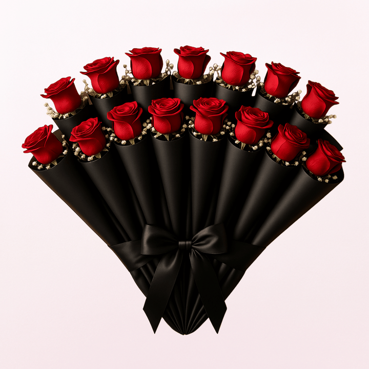 This product includes multiple single red roses, and each rose is individually wrapped in a matte-black cone with gypsophila. The roses shown together in the image are arranged only for visual presentation. The box is not included. You will receive the roses as separate single-stem pieces, all individually wrapped, neat, clean, and ready to hand out. This is ideal for bulk gifting, events, surprises, corporate distribution, schools, or any occasion where you need many single wrapped roses delivered together. If you need other colors like pink or white, you can message us anytime for custom quantities as well.